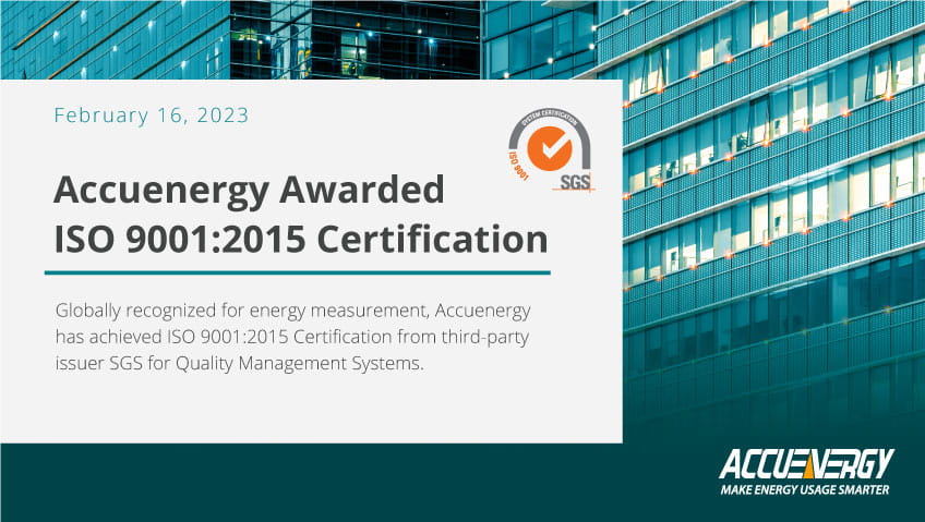 "Achieving the ISO 9001:2015 certification reflects our core commitment and attitude towards building high quality power metering instruments," said Accuenergy Director of Business Development Howard Wang. "Customers can be confident our product and services meet international regulatory requirements."