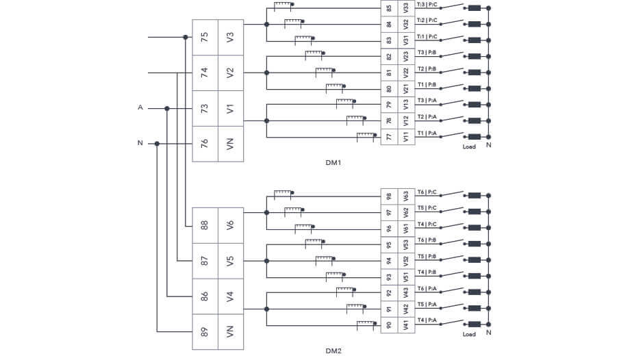 The system you are monitoring has a voltage lower than 400V LN or 690V LL and you are using the DM Module current input, the connection diagram is shown below.
