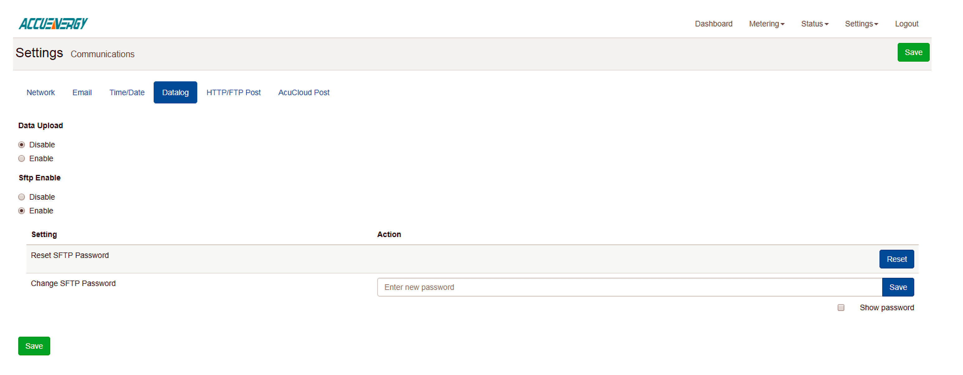 By default the password for retrieving the backup log files is 'accuenergy'. The user can configure any password or can reset to the default of accuenergy by clicking on the "Reset SFTP Password". NOTE: After enabling the SFTP function the user must reboot the communication module in order to access the data logs with the default password of 'accuenergy'.