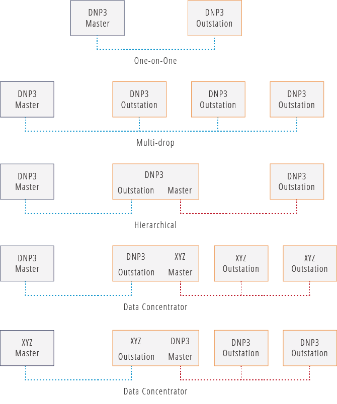 Like several other industrial communication protocols, DNP3 is arranged in a Master/Slave relationship where slave devices are designated as “outstations.” Typically, a master device is computer found in a utility’s control center, while an outstation is a remote device (i.e., a meter, RTU, PLC, IED, or computer) located at a substation or other distant location. In this hierarchy, master devices issue commands to outstation devices, such as to start or stop a motor, change a voltage level, transmit logged energy data, or close a circuit breaker. DNP3 also allows outstations to initiate communications with master devices under certain circumstances.