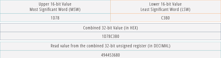 Larger values require 32-bit registers which are created by combining two 16-bit registers. The two registers need to be transmitted and interpreted in a specific “byte order” to correctly read the value. By default, the high-order byte (“most significant word”) is transmitted first followed by the low-order byte (“least significant word”). Data is transmitted using hexadecimal, which uses digits 0-9 and letters A-F; a single register value can range in hexadecimal from 0 to FFFF.